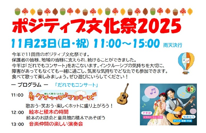 社会の一員として地域の人々と交流し、子どもと共に『ポジティブ』が社会参加することで、誰もが助け合い、支え合い、一人ひとりの個性が尊重されるまちづくり、居場所づくりを目指します。